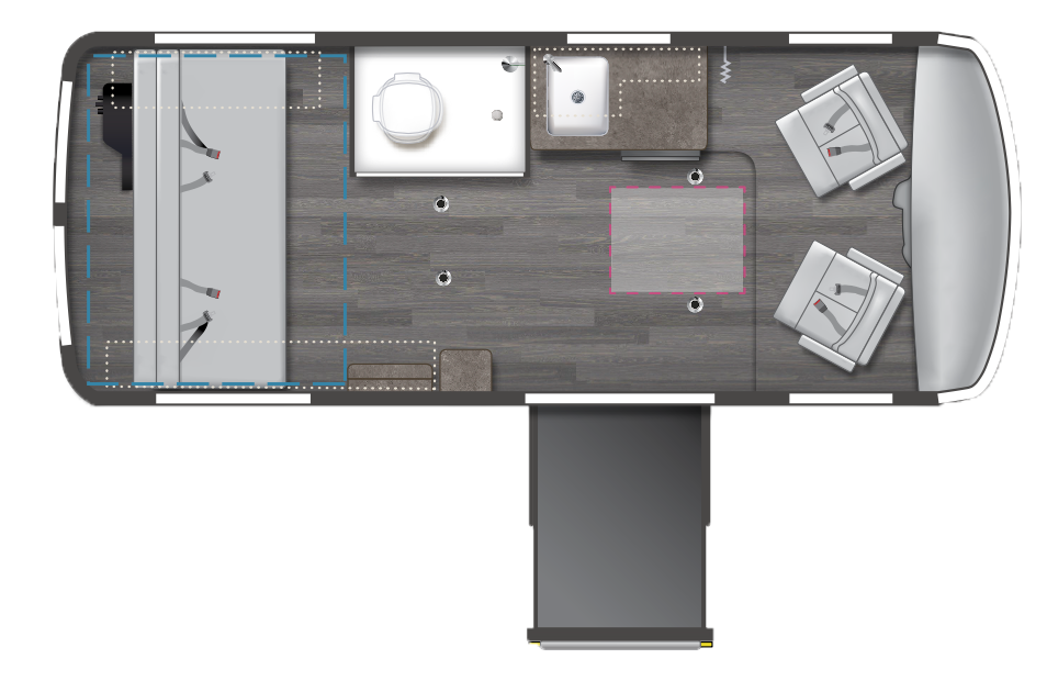 The Roam offers two floor plans to choose from the U59RAC and U59RPT. Both floor plans have the same basic layout, which includes a wheelchair lift, wheelchair tie-downs, an accessible bathroom, a reclining sofa/bed, and more. The main difference between the two is that the U59RAC has a roof-mounted air conditioning unit, while the U59RPT is equipped with a pop-top roof that can sleep an extra two people.