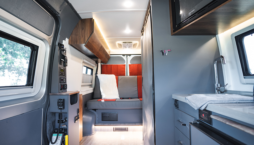 Once inside you’ll notice the spacious interior, the galley is equipped with a refrigerator, microwave, and sink, as well as an outlet for an induction cooktop. This means you can bring along all your favorite ingredients and prepare your meals just about anywhere you go, whether you’re parked at a campsite or on the road.