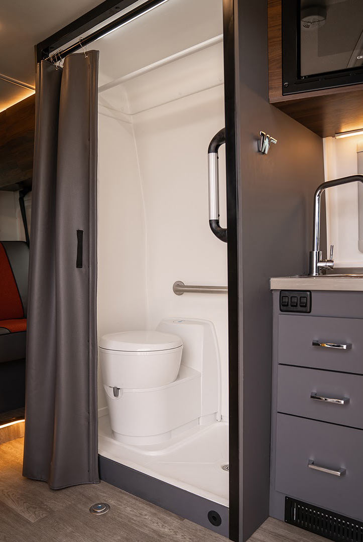 Adjacent to the galley, you’ll find the Roam’s spacious wet bath complete with an integrated shower and a cassette-style toilet. The wet bath eliminates the stress and inconvenience of trying to find a suitable bathroom while you’re away from home, making it easier to enjoy your travels with peace of mind.