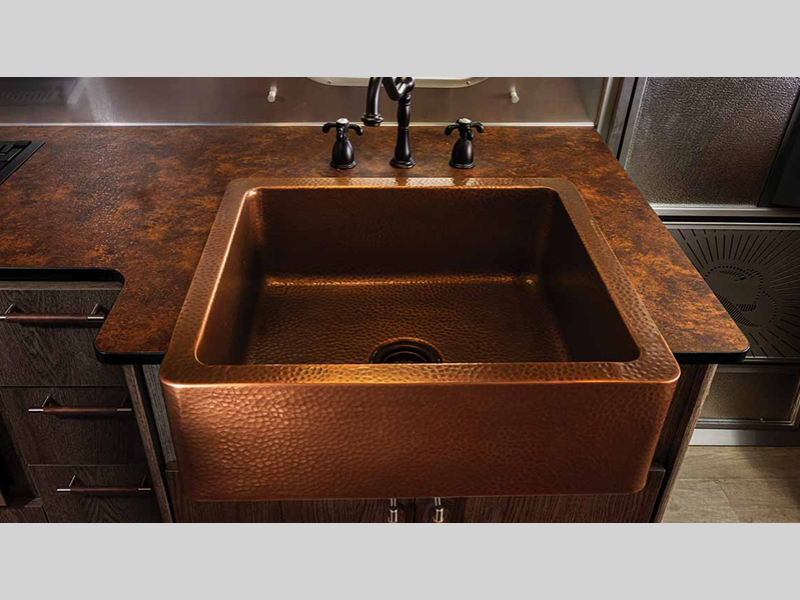 This 27-foot tribute features a collaboration between the hatmakers of Stetson and the ranchers of the Four Sixes Ranch in Texas, which will bring you premium finishes, handcrafted cabinetry, hat racks and leather seating, plus a copper front apron sink that will make you feel like you're back at the farm! The rear hatch will let you bring the outside in with wide open views and fresh air, and there is an overhead cabinet in the rear end cap, so you can easily grab your Stetson on the way out the door!