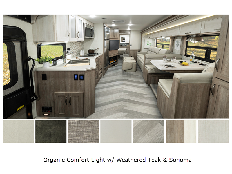 Sleeps 5 Slides 2 Length 35 ft 10 in Ext Width 8 ft 6 in Ext Height 12 ft 1 in Int Height 6 ft 10 in Interior Color Organic Comfort Dark, Organic Comfort Light, Bohemian Oasis Exterior Color Full-Body Paint; Silvermist, Wedgewood ll, Steel Grey, Night Sky Hitch Weight 5000 lbs GVWR 22000 lbs Fresh Water Capacity 74 gals Grey Water Capacity 51 gals Black Water Capacity 63 gals Tire Size 22.5" Furnace BTU 40000 btu Generator 5,500-Watt Cummins Onan Marquis Gold Fuel Type Gas Engine 7.3L V8 Chassis Ford F53 Fuel Capacity 80 gals Wheelbase 228 in Available Beds King Refrigerator Type Stainless Steel Residential with Ice Maker and Water Dispenser Convection Cooking Yes Cooktop Burners 3 Shower Size 36" x 36" Number of Awnings 1 Axle Weight Front 8000 lbs Axle Weight Rear 15000 lbs LP Tank Capacity 76.14 lbs Water Heater Capacity 10 gal Water Heater Type 110V/LP AC BTU 28500 btu Basement Storage 137 cu. ft. TV Info LR 39" HDTV, BR 32" HDTV, Ext. 32" HDTV Awning Info 16' Power w/LED Lighting Washer/Dryer Available Yes Gross Combined Weight 26000 lbs Shower Type Standard Electrical Service 50 amp Similar Floorplans