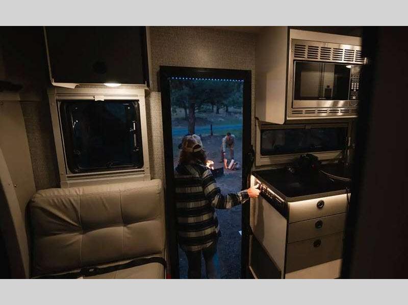 The Mercedes-Benz AWD Sprinter chassis with elevated ground clearance and all-terrain tires easily navigate low-traction environments, and the 2.0L high output turbo diesel 4 cylinder engine will power you to your favorite destinations. With a new multifunctional lounge, you can configure it into four different modes to meet your exact needs at different times. You also have a flexible galley to prepare your best home cooked meals while on the road!